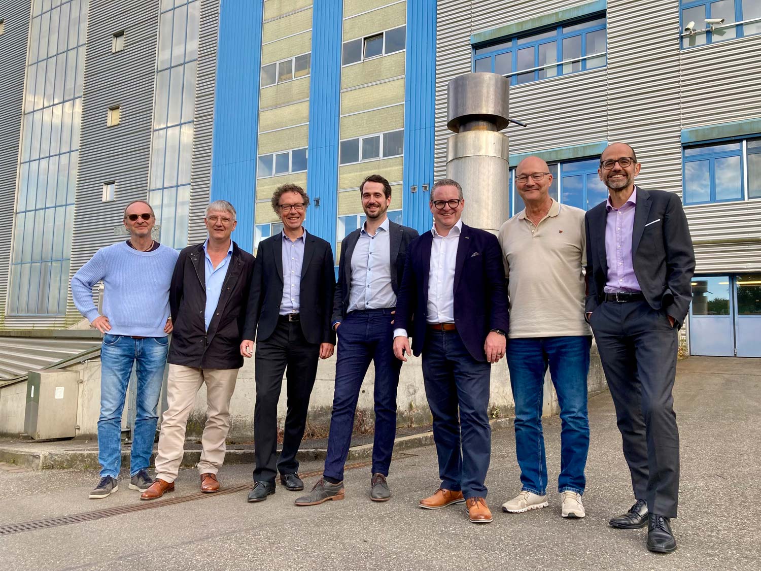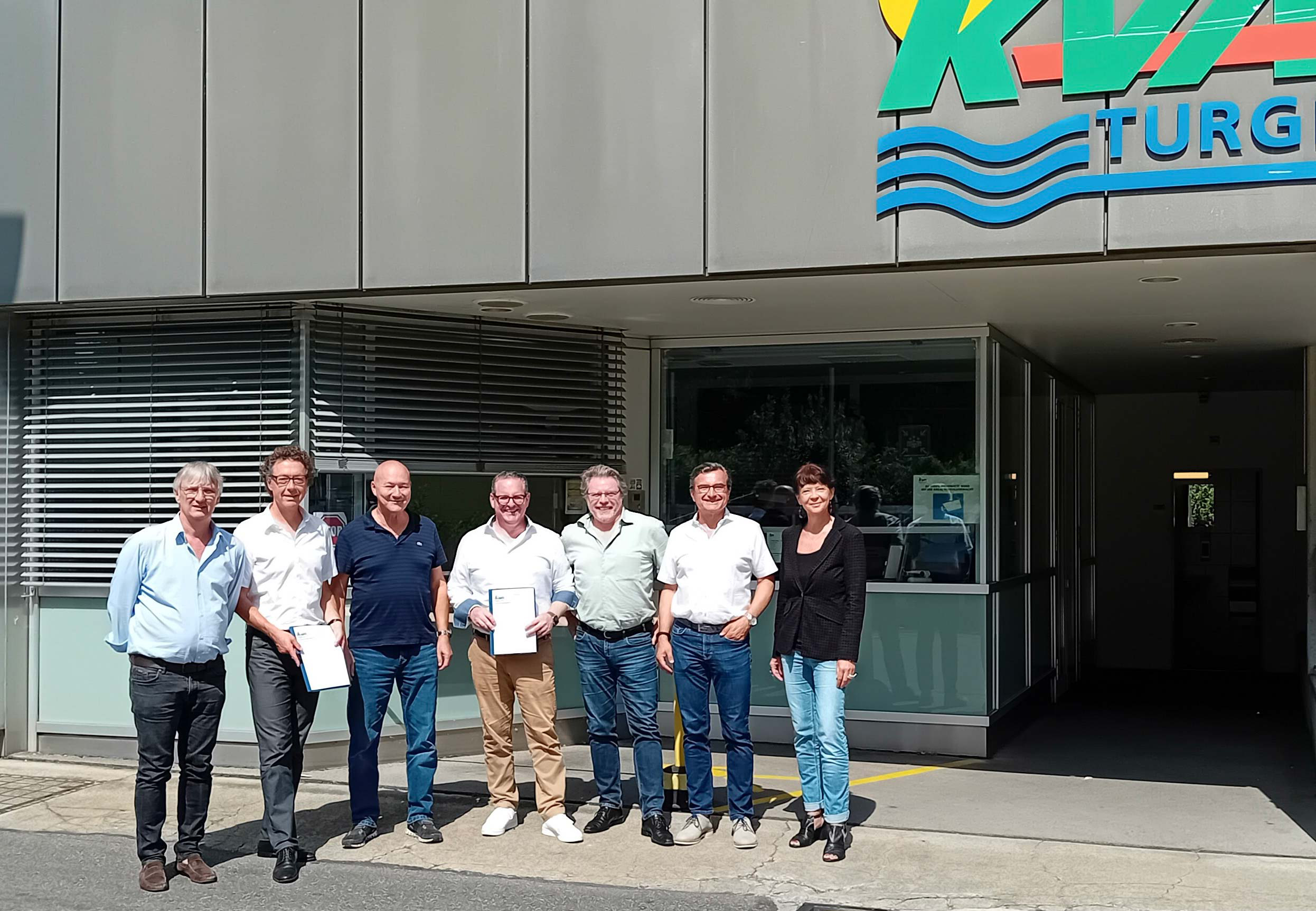 KVA-Präsident Philippe Ramseier (Mitte) nach der Unterzeichnung des Planungsvertrags, flankiert von (v. I. n. r.) Matthias Walther (B+T Engineering), Andres Kronenberg (Ramboll Schweiz), Peter Ender (Direktor KVA Turgi), Flavio Bettoni (B+T Engineering), Arndt Fiedler und Petra Lüthy (beide Fiedler Beck Ingenieure).