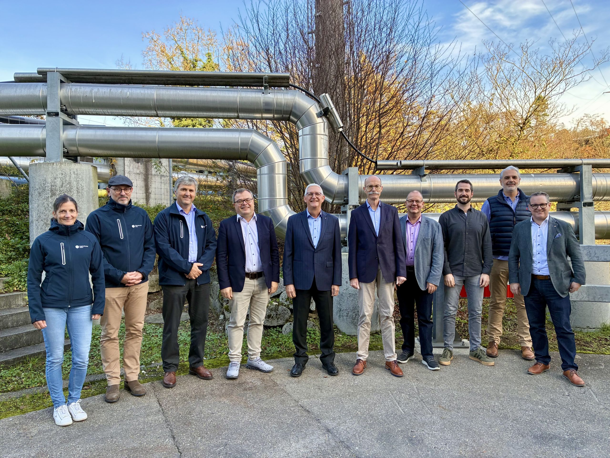 Zur Planergemeinschaft gehören u. a. Matthias Walther von B+T Engineering (Gesamtprojektleitung, 2. v. I.) und Andres Kronenberg von Ramboll Schweiz (Leitung Verfahrenstechnik, 3. v. I.). Anlässlich der Abgeordnetenversammlung vom 22.5.2024 posieren sie zusammen mit
